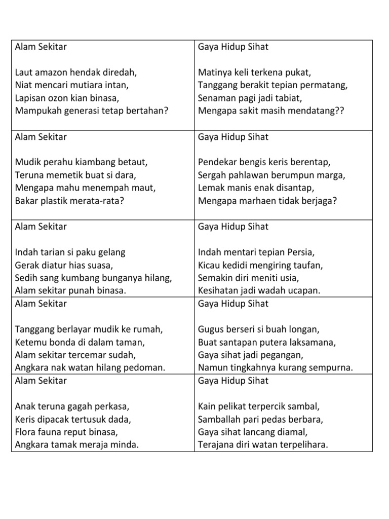 Pantun Gaya Hidup Sihat. Ikan dibeli si anak sahlan Sarat bunga di taman igauan seman amalan. Jan 05 2020 amalan gaya 1 sihat membawa 11 dt 111 perkataan dan rangkai kata 1 hidup sihat kebahagiaan 21 bc 211 bacaan mekanis 31 tu 311 membina ayat 41 sb.